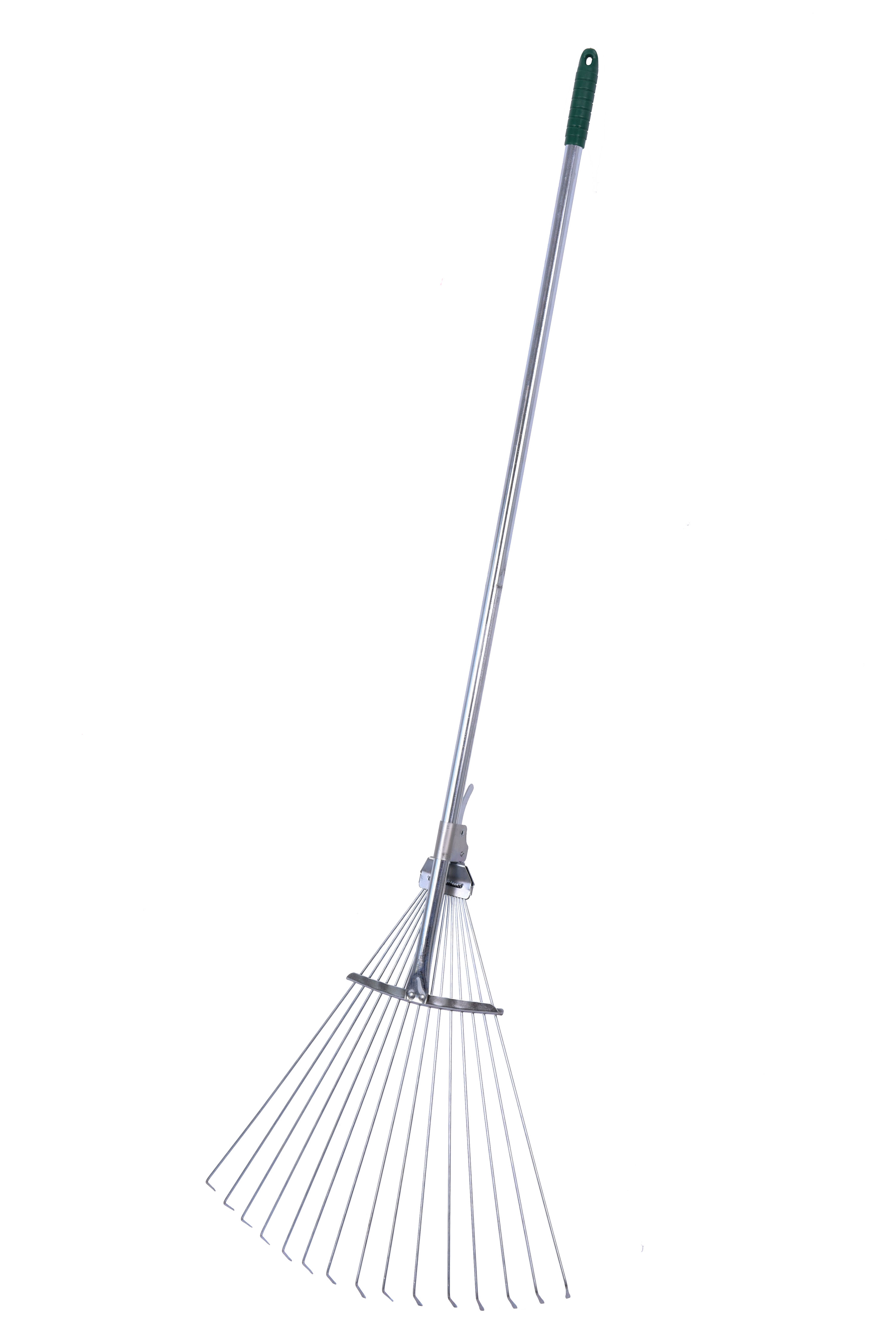 Poręczne grabie do grabienia liści, trawnika z możliwością regulacji . Całe metalowe. Końcówka trzonka metalowego zakończona rękojęścią gumową w kolorze zielonym.