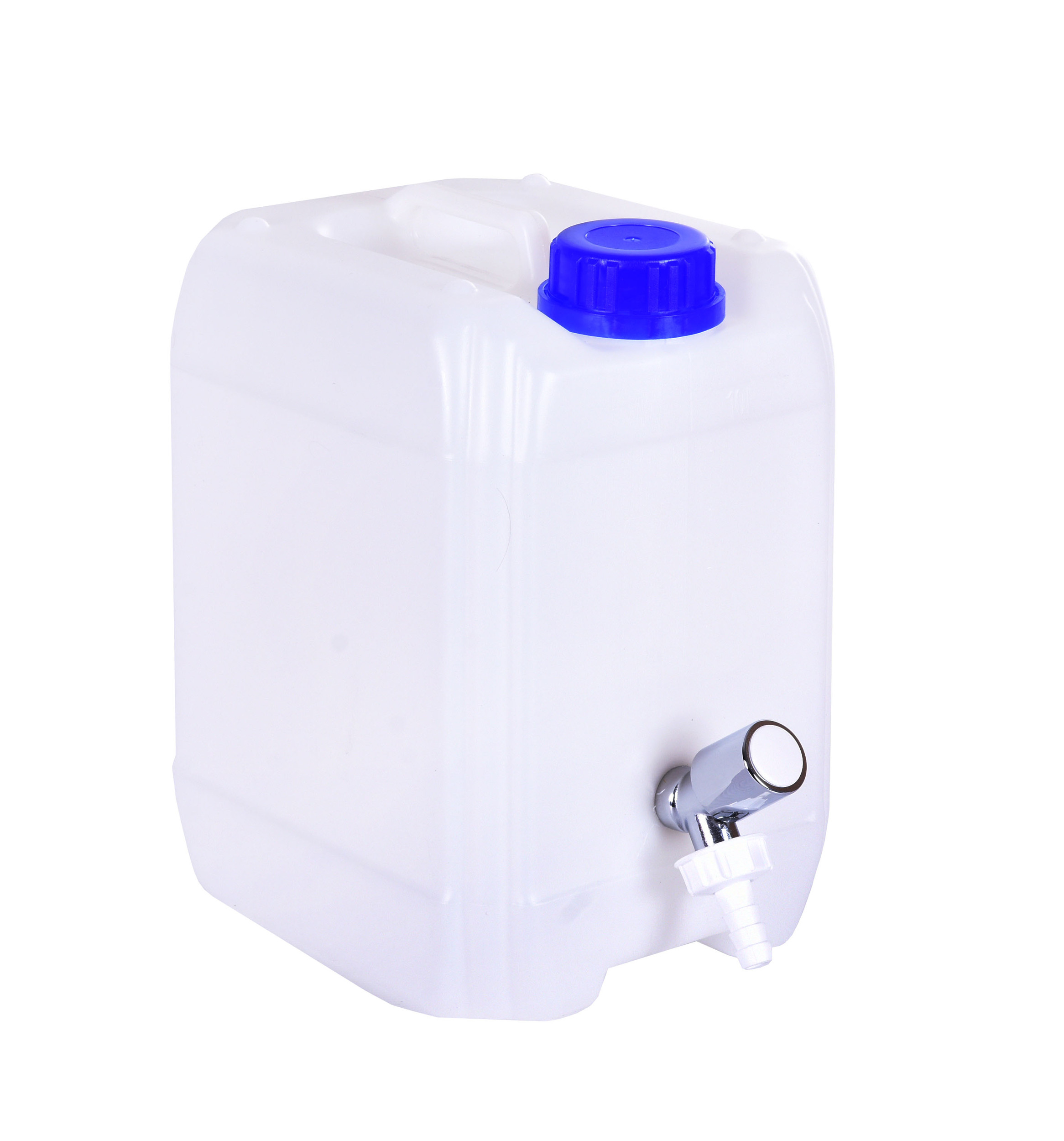 Plastikowy kanister o pojemności 10 l w kolorze białym. Posiada metalowy kranik z końcówką.